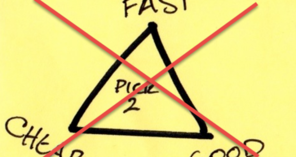 We have all heard about the Iron Triangle; Good-Fast-Cheap, pick two! True, very true, but that was back when a mobile phone meant the police car radio, gas was 65 cents a gallon, and owning a 19” color Sony Trinitron TV was very cool. The Iron Triangle is not, and can’t be true in 2019. Advances in software engineering methodologies, architecture, tools, and platforms, and a very skilled workforce negated the false necessity of the Iron Triangle ‘pick 2’. Another reason for the ‘rusting’ of the Iron Triangle is the business demand for a more efficient and effective software engineering output. It is no longer acceptable, or tolerated to hide behind the ‘pick 2’ mantra.